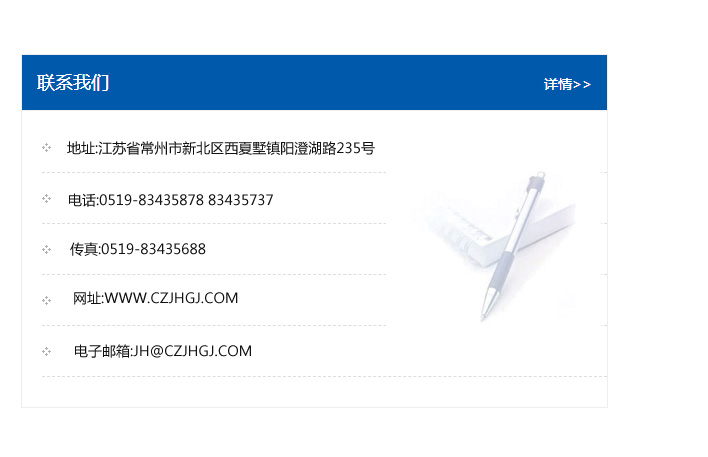 地址:常州市新北區友邦商務大廈1幢16、17層  電話:0519-85101652  傳真:0519-85112595  郵編:213022  網址:www.cz-jiayue_cn.wfbangda.com  郵箱:xiajifengaa@163.com